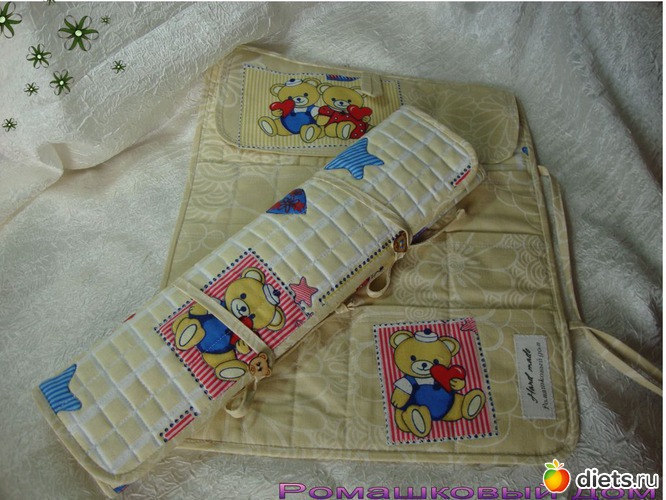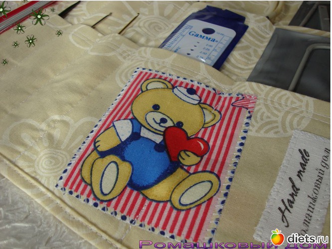 Несессер (органайзер) для вязальных принадлежностей с медведями Вы сможете хранить все вязальные принадлежности в одном месте и без труда брать их с собой. Нессер может стать отличным подарком. Использованы: бязь, холофайбер, тесьма. Основа простегана свободно-ходовой стежкой. Размеры прим. 40*33 см, 7 карманов под круговые спицы и 12 под спицы и крючки, клапан, 2 завязки, 2 деревянные пуговки медвежата, выстеганная основа, 2 аппликации "заплатка" на клапане, и нижнем кармане, петелька - можно при желании подвесить, для наполнения основы использован холофайбер Цена 800 руб