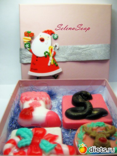 БОЛЬШОЙ НОВОГОДНИЙ НАБОР Отличный большой набор мыла, очень ароматный и красивый. В набор входит 4 кусочка мыла: леденец, сапожок, кобра и олень Рудольф. Мыло упаковано в большую подарочную коробку с дедом Морозом. Цена 550 руб