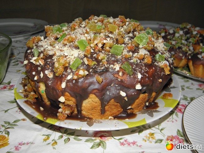 Кулич, как вы заметили, не классический. Кулич миндальный, с изюмом, украшен шоколадной глазурью, цукатами и орешками..наверное, поэтому его так хорошо ели)))