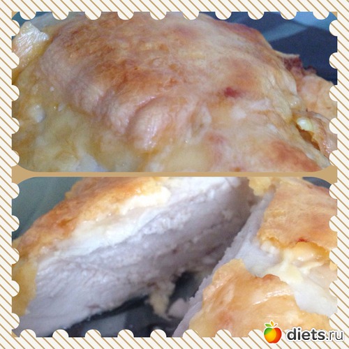 Половинку куриной грудки залила яйцом, сверху посыпала сыром соль, перец по вкусу, в духовку на 25 минут 250с