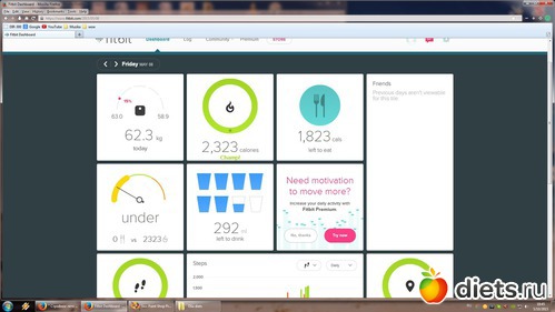 Хоть и невериться что я сожгла 2323 ккал за день. Наставляется программа похудения, у меня темп средний выбран, то есть дефицит -500 ккал в день. Показывает что можно было есть на 1823 ккал, но я туда не записываю еду.