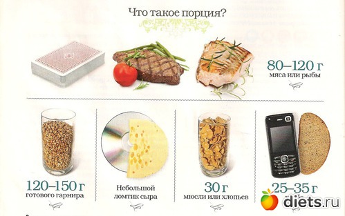 Прикидываю сначала по отдельности: допустим, я решила поесть только порцию мяса на обед. Одной очень мало, останусь голодная, а пары порций, может, и хватит, сложно сказать. Или прикидываю порцию гарнира - вот порций гарнира двух штук хватит с головой, третья точно не нужна. А если вместе одну порцию мяса и одну порцию гарнира, то это будет порция обеда и ее точно хватит часа на три - я проверяла, часто беру в "Теремке" гречку с куриным филе как раз в этой пропорции. Автор про какие порции пишет - про отдельные порции продуктов или про порции основного приема пищи?
