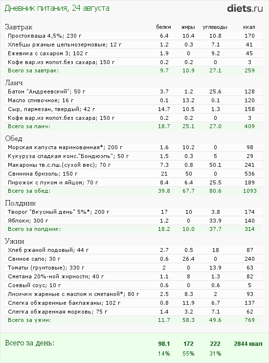 А я вчера решила посчитать денек мужа, чтобы понять, почему он располнел. Правда, обед пришлось считать наобум, потому что муж хоть и помнит, какие продукты он ел в столовке, но не помнит их вес. Я так прикинула - ему можно не больше 2300 ккал в день, а получилось значительно больше.