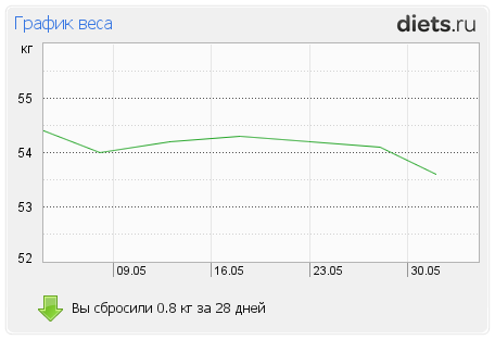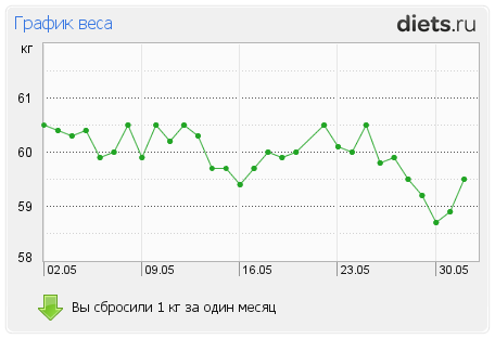 А так питание и вес утром : 28.05 - 59,5 кг. - 1409кк; 29.05 - 59,2 кг. - 1450кк ; 30.05 - 58,7 кг. - 1366кк ; 31.05. - 58,9 кг. -1579 кк ; 01.06. - 59,5 кг