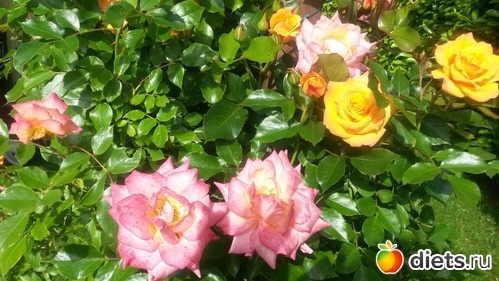 Раз такое дело, то еще немного про розы расскажу. Вот эта роза совершенно уникальна. На фотографии один куст. Но бутоны этой розы всегда оранжевые (это те, которых много у меня в вазе во вчерашних фотках), когда она распускаются становятся ярко-желтыми, а ближе к отцветению приобретают яркий розовый оттенок. Дает очень много цветов (это вьющаяся роза). Когда на нее смотришь, то складывается впечатление, что там несколько кустов.