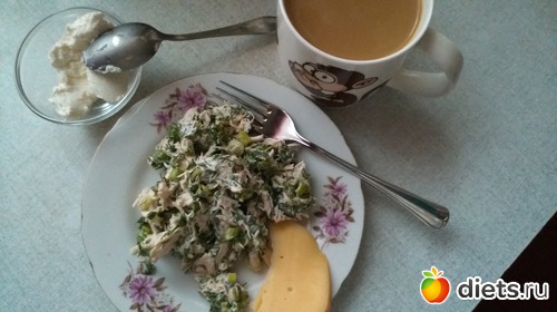 Мой косячный завтрак (творог(40), сыр(20), салат из грудки с з.луком, укропом и сметаной (140), цикорий с молоком. Итого 350ккал
