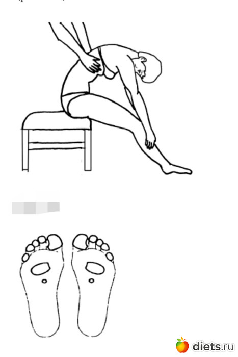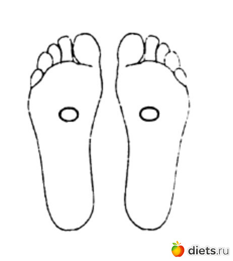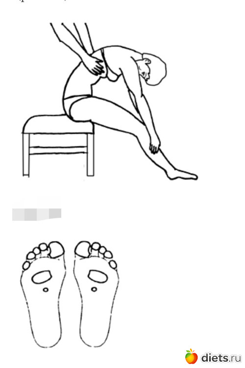 Выполнение. Для устранения нервозности необходимо выполнять поглаживающий массаж спины, затем промассировать рефлекторные зоны стопы (рис. 2). Посередине стопы располагается активная точка, которая регулирует обмен энергии в области солнечного сплетения.