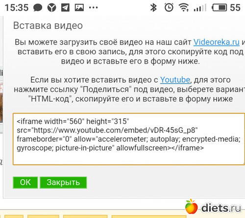 Пробуй еще. Почему-то так случается, что надо несколько раз повставлять ссылку, чтоб видео наконец-то впихнуть. Это так именно на Диетсе.