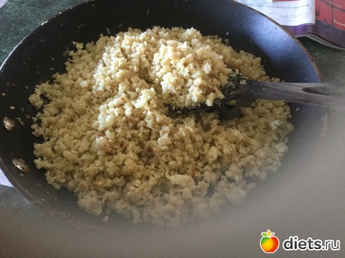 Сначала жаришь лук на сливочном масле(на кокосовом не то). Вилок сырой цветной капусты разбиваешь в измельчитель в импульсном режиме до крупки( но не до каши) Полученную кружку перемешиваешь с белками( на килограмм парочку надо) и выкидываешься на сковородку с луком.Жаришь на среднем огне,постоянно помешивая,чтобы белок не сбился в комки до нужной готовности(кому-то нравится полусырой,а я накрывала крышкой,чтобы пропарить). Солить в готовом состоянии,добавить перец специи по вкусуд