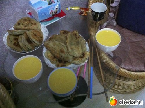 Это обычный завтрак. Лепешки с начинкой из яйца и много зеленого лука и отвар кунжутно-арахисовой жидкой каши. Или овощи и рис.