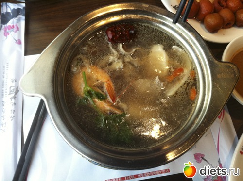 Это обед. В кастрюльке все свежайшее - очень много зелени. Туда же в этот бульон - вместе мясо и морепродукты