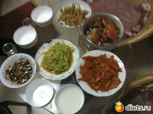 Это ужин. Опять много свежих морепродуктов и овощей. Я жила в семьях разных, но не богатых. Очень разнообразная еда. В одно и то же время дня.