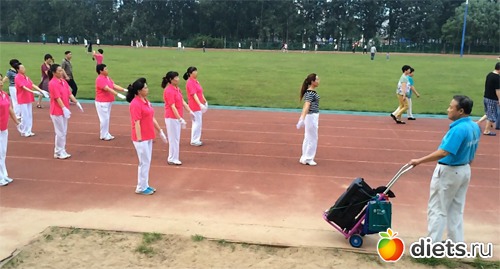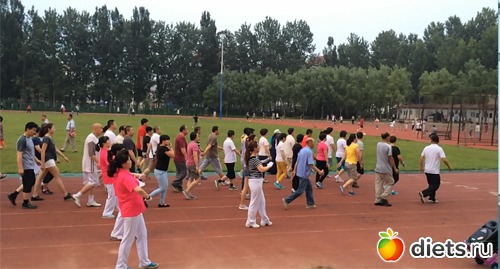 Во-вторых, у них стадионы(или площадки для здоровья) даже в деревнях. И многовековая привычка - ходить ритмично в компании. Идут и одновременно разрабатывают и координацию движений и плечевой пояс и тренировку дыхания. Вот стадион: там есть дядька с мобильным динамиком. Есть группа волонтеров в футболках, они бесплатно сами тренируются и привлекают других желающих идти с ними круг по стадиону одновременно выполняя движения руками. На нижнем фото я тоже с ними иду - в той колонне, что ближе к газону, у меня светлая шляпка с бирюзовой лентой