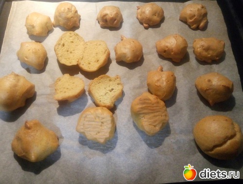 порепетировала профитроли. Как и предупредила Марина Пилипенко, на бумаге получились булочки. Но тоже норм. Я делала не на отрубях, а на кунжутной клетчатке. Думаю, что с миндальной мукой будет супергуд. Для намазок хочу.