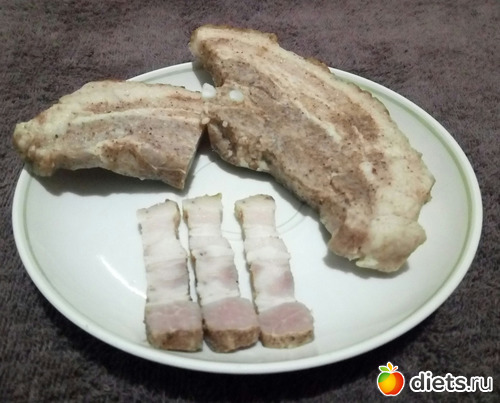 Наталья, ты спрашивала про вес грудинки. Сегодня купила 2 больших, одна 800 г, другая 1000 г. Зависит от толщины нарезки и какой кусок мяса прикреплен к косточке.