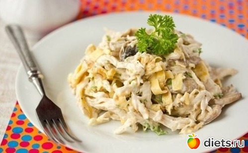 В подсоленной воде отварите куриную грудку. Потом остудите её и нарвите волокнами. В салатнице соедините грибы, "лапшу" и курицу. Перемешайте ингредиенты. Чеснок почистите и пропустите через чеснокодавилку. Петрушку промойте, нашинкуйте. Добавьте оба продукта в салат вместе со сметаной. Перемешайте салат. Оставьте его на полчаса в холодильнике, а потом подавайте.