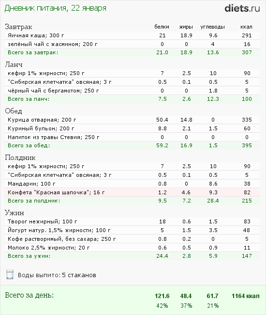 Воды маловато, но у нас ещё нет и 7 вечера, выпью ещё пару стаканов, хотя для меня это уже подвиг! Воду редко пила раньше, в основном чай, кофе, соки и компоты. Жду свежего взгляда на меню съеденного, и конечно же отзывы, если что то не так... Никогда не считала калории, это первый опыт.