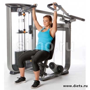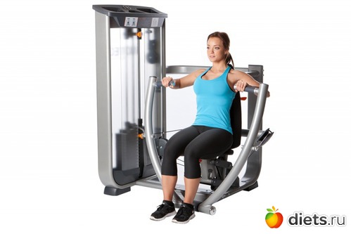 Правильная техника Уровень рукоятей тренажера устанавливается немного выше или на уровне плеч атлета. Ноги расставляются немного шире плеч и хорошо упираются в пол. Желательно держать колени согнутыми под прямым углом. Голова и спина плотно прижаты к спинке тренажера. Следует занять исходное положение – схватиться за рукояти ладонями вперед на ширине плеч. Совершается глубокий вдох, дыхание задерживается и рукояти выжимаются от себя. Когда руки будут полностью выпрямлены, можно сделать небольшую паузу, задержав дыхание. В этот момент рукояти плавно возвращаются в исходное положение. Не рекомендуется делать паузы между повторениями, так как мышцы успеют расслабиться. Лучше сразу же приступить к выполнению нового движения, чтобы держать грудь и руки в тонусе.
