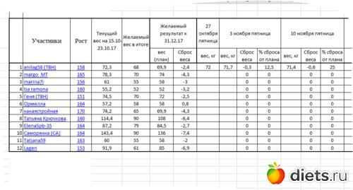 Посмотрела сейчас нашу общую таблицу, если выставить прошлую пятницу как начало, то на моем примере это не показательно получается вес 72,6 кг, а ТВН 72,3 кг...буду думать, но меня в пример можно не брать, если девочки будут взвешиваться раз в неделю в пятницу, то видимо это тоже как то надо обозначить...(может РАЗОВОЕ?)