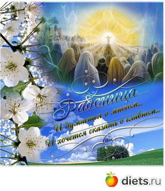На Радоницу, как и на Пасху, принято красить яйца и приносить их на могилы усопших вместе с выпечкой и другими угощениями. Там, на кладбище, совершается поминальная трапеза, часть еды отдается нищим, чтобы те помянули умерших.