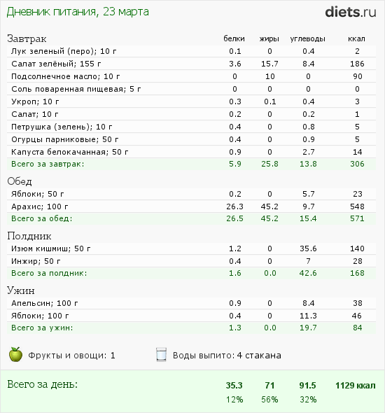 Завтрак 2 яблока, ланч 2 киви, 4 инжира, обед суп 400 г / тыква + квасоля белая /+ икра из синеньких 20 г, полдник суп 400 г, ужин - нарушила съела 50 г кукурузных палочек и 100 г хлеба, но за пределы оказывается не вышла = 1167 ккал