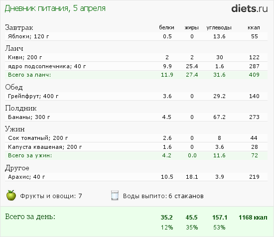 Углеводный день - завтрак 1 яблоко, ланч - 1 яблоко, обед гречка 50 г + томатный сок + 1 кусочек хлеба, полудник - овяное печенье - 100 г + томатный сок, ужин - 25 г черного шоколада, вода 10 стаканов. =1054 ккал