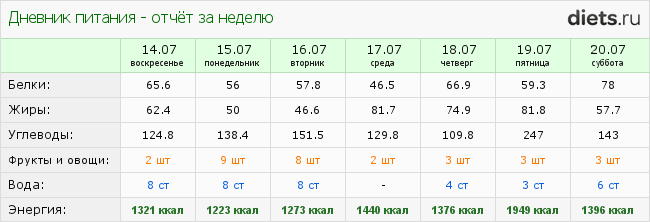 Вот моя таблица за неделю. Количество жиров 14 и 15-го - это говядина...