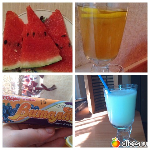 Арбуз, батончик, чай зелёный с лимоном, коктейль из кефира и сельдерея.
