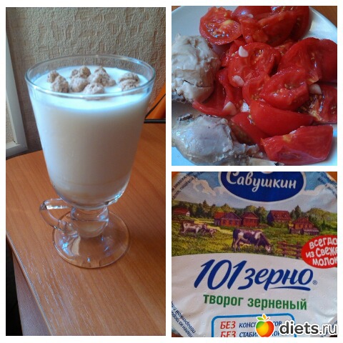 з: салат из помидор и огурцов, заправленный кефиром и нежирным творогом+яйцо+кусок бородинского хлеба