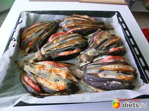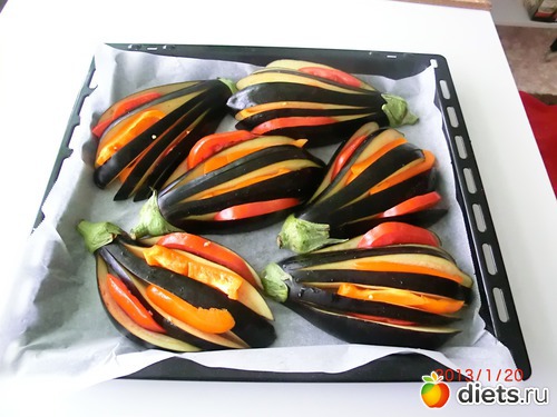 Берем 3 хороших баклажана ( как раз на лист ). Режем пополам, так чтобы хвостики остались, не обрезаем. Потом как веер. Хорошо обсыпаем солью. Даём полежать, что бы горечь ушла. Салфеткой промакиваем. Кладём на лист и собираем хвост жар-птицы. Между разрезов слева на право ( или наоборот ) кладём пластинки помидор, затем паприка, потом сыр, бекон( можно слегка подкопченный), снова паприка и последним помидоры.