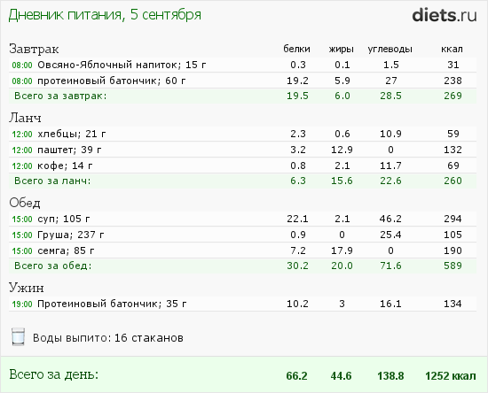 днём вода зелёный чай. если сильно проголодаюсь бульон с курицей.