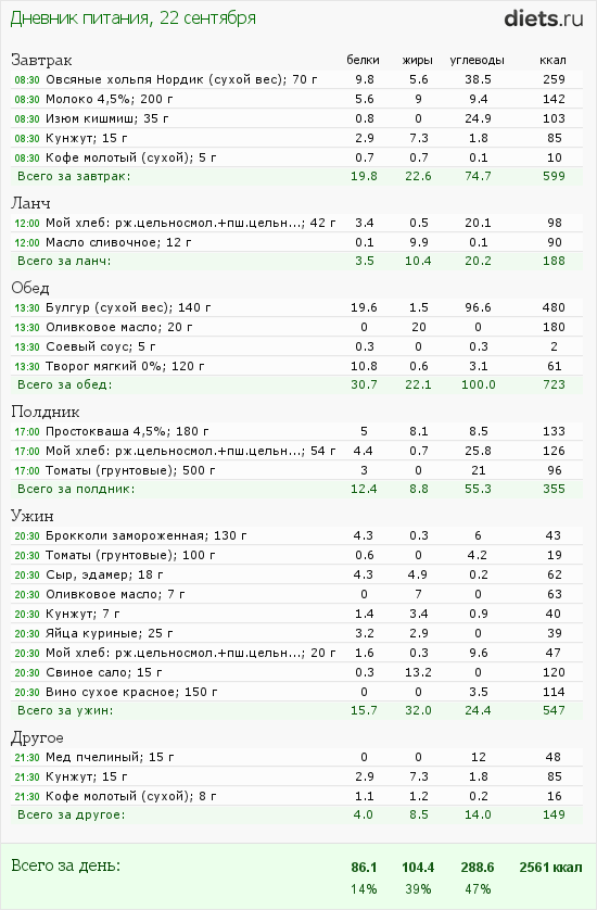 Физическая активность за день: два раза ходьба в быстром темпе по часу, немного работы в саду. Домашнюю гимнастику не считаю, так как она всего лишь на 15 минут и не для расхода энергии, а так чисто для тонуса.