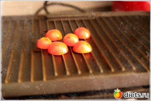5. Разрезаем помидор на кружочки и той же сковородке слегка обжариваем их.