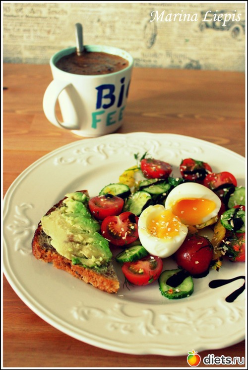 Салат из свежих овощей с маслом (грецких орехов или виноградных косточек), яйцо всмятку, чайная ложка отрубей, бутер из зернового хлеба с авокадо.