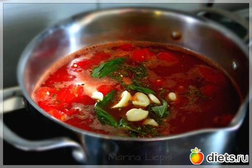 Я беру 2 большие банки томатов (850 гр каждая), + 600 мл воды, граммов 40 сахара, 5 зубчиков чеснока, горстку базилика, соль-перец по вкусу.