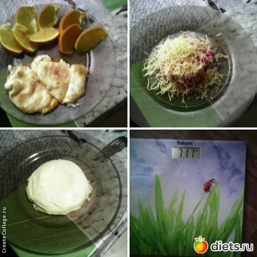 • Ужин: смесь из свежих фруктов (апельсин, мандарин, дыня, персик, яблоко)