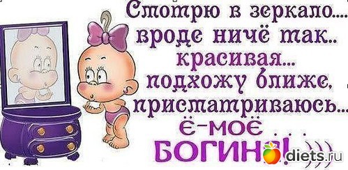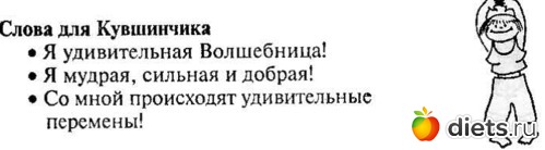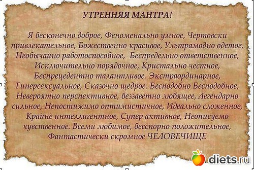А за что можно похвалить себя? Да за каждый шажок в нашем нелегком, но благодарном деле обретения стройности. Поощрение может быть выражено словом, короткой фразой (прислушайтесь к близким по смыслу фразам на других языках - некоторые звучат красиво и действуют магически). Можно написать оду себе любимой. Можно придумывать себе каждый день новые имена. Это может быть и материальное поощрение, да и просто улыбка себе в зеркале.