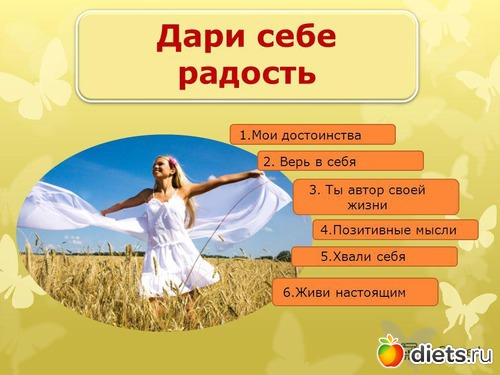 Очень часто мы в процессе борьбы с лишним весом имеем склонность быть очень суровыми к себе. Разве нужны еще враги, если, глядя в зеркало, встречаешь самого враждебного критика своей личности? Мы замечаем только плохое и браним себя за все, что делаем неправильно. По сути, каждая из нас могла бы стать лучшим другом самой себе. Важно, чтобы мы научились поощрять себя за все, что мы делаем правильно.
