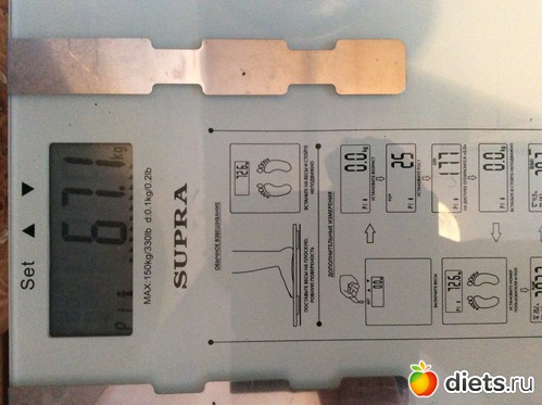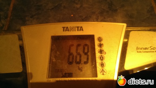 1-я неделя: 66.9, жир 28,8%, вода 49,9%, мышцы 45.2 кг (запишу для себя: 22-й день цикла)