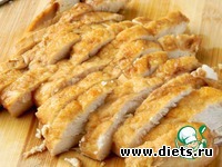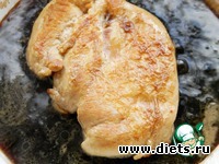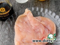 Приготовление: 1. Смешать все ингредиенты для маринада. Филе (без кожицы) нарезать небольшими кусками, залить маринадом, и поставить на 1 час в холодильник. 2. Разогреть сковороду, выложить мясо вместе с маринадом, жарить на большом огне, пока маринад не загустеет, затем уменьшить огонь, накрыть крышкой и подержать еще 5 минут.