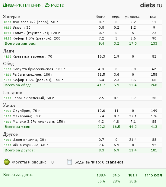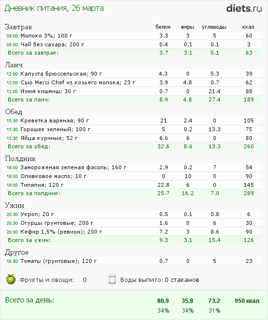 На ночь – два белка куриных яиц.Итого: белка – 5,11 г; жиров – 0 г; углеводов – 0 г.ИТОГО ЗА ДЕНЬ: белка – около 76,25 г; жиров – 36,7 г; углеводов – 115,61 г.