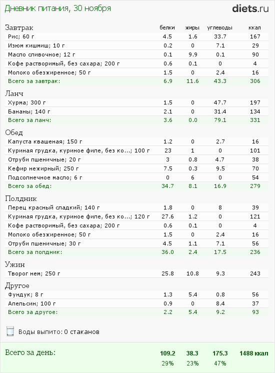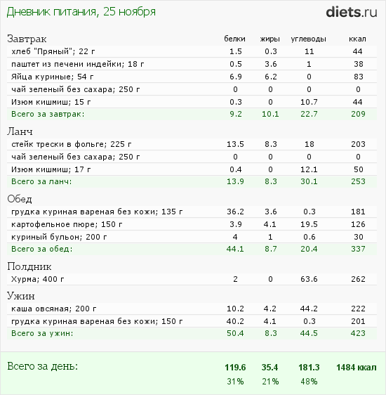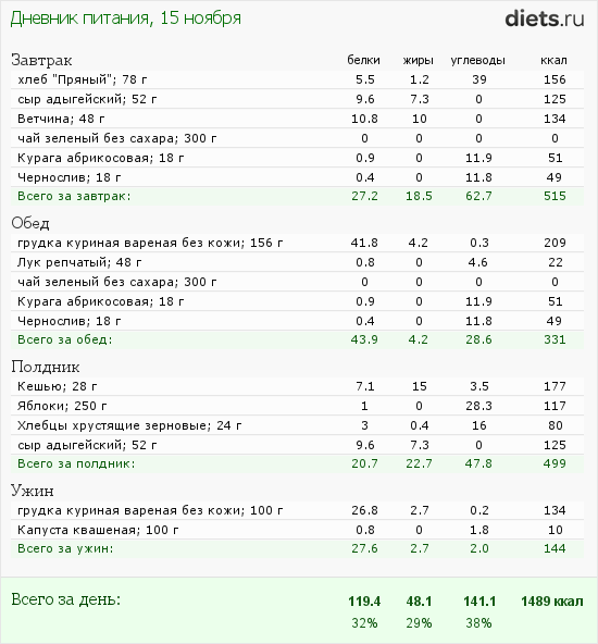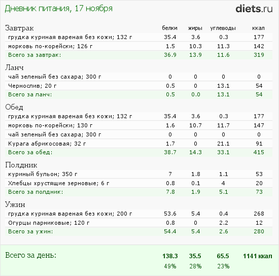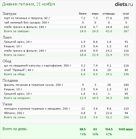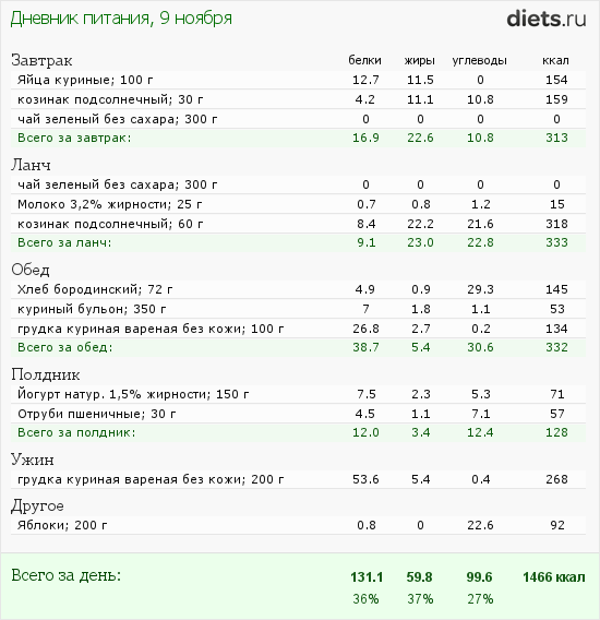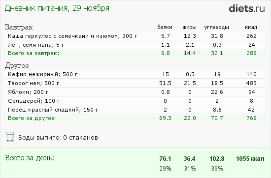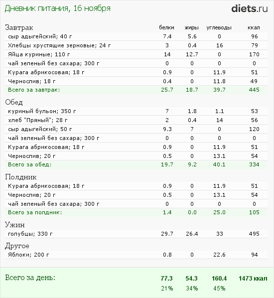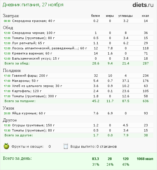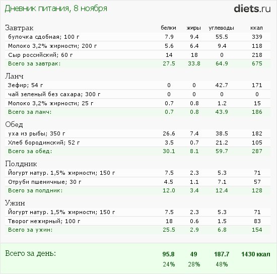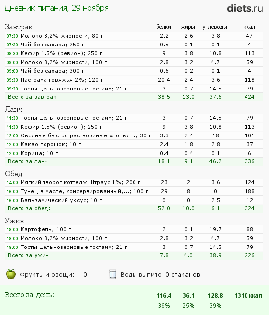 То, что записано как ужин - это супчик с вермишелькой, картошечкой и говяжьим фаршем, съеденный в два приема. Очень вккусненький получился Там еще приправы и один бульонный кубик, калорийность которого я не подсчитала, надеюсь - это мелочь