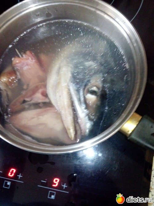 Обед: сварила семгу (голову и хвостик)вода лук зелень,немного соли