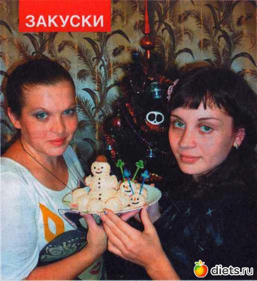 6. При подаче сформовать снеговиков. Глаза и пуговицы сделать из горошин черного перца. Блюдо будет вкуснее, если в середину каждого шарика добавить оливку.