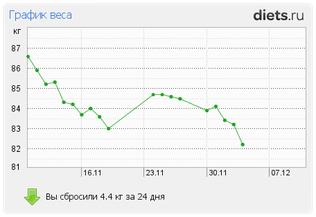 В вашей группе я с середины ноября, но до этого с 1го (примерно) сидела 2 круга на лепестках (2 недели). Начала с веса 88,5, сейчас 82,2кг.