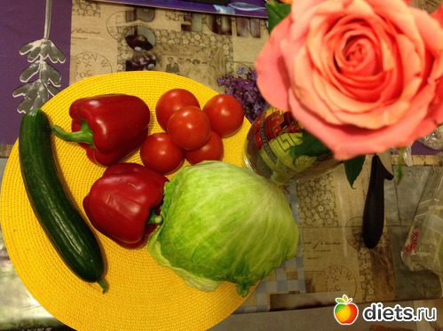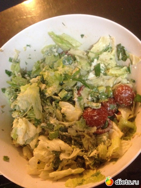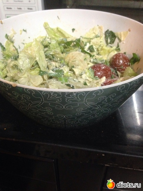 Мой вечерний салатик. Таким можно роту накормить. Но ничего, Ковальков разрешает любое количество овощей, а по части масла и творога у меня все строго по правилам