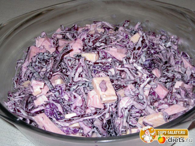 Мелко нарезать фиолетовую капусту, добавить консерву тунца в собственном соку, добавить ворог зернёный.
