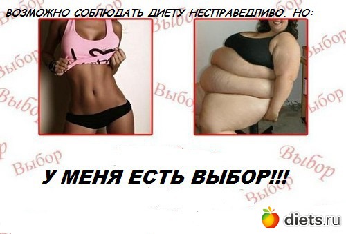 Когда у нас появится мысли относительно нашего питания, которые начнутся со со слов:"Это несправедливо...", у нас всегда есть выбор! Либо мы зацикливаемся на этих мыслях и чувствуем себя несчастным, а потом жалеем и наедаемся, либо мы можем сказать себе: "Да, это правда... Это несправедливо... Ну, ничего!" И направим свои мысли на другую несправедливость: вспомним те преимущества, которыми пользуются стройные люди, а мы нет и что все в наших руках, а также на те преимущества (не касающиеся веса), которые есть лично у каждого из нас, но нету у многих других.