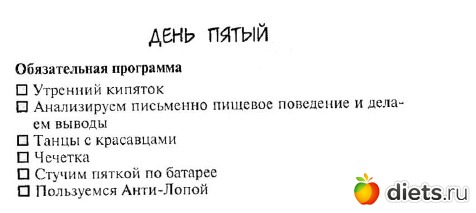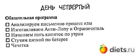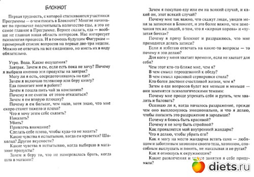 Заведите РАБОЧИЙ БЛОКНОТИК, в который вы с сегодняшнего дня будете записывать все, что собираетесь съесть, - и все, что съедено вами. Этот блокнот должен находиться постоянно при вас, лучше повесить его на руку - поэтому он должен быть достаточно небольшим. Этот блокнотик - наш главный инструмент.