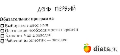 Выбирайте себе новое имечко - это нужно для большей уверенности в своих возможностях. Вот эту обжору и сластену, которая с интересом выглядывает из зеркала, зовут вашим прежним именем. А ту новую, которая приведет себя к идеальному своему образу, и зовут по-иному. Новое имя должно быть ярким образом, а не пустым набором слов, оно все время развивается и наполняется новыми красками. Каждый раз оно должно сверкать новым, ранее не замеченным оттенком!